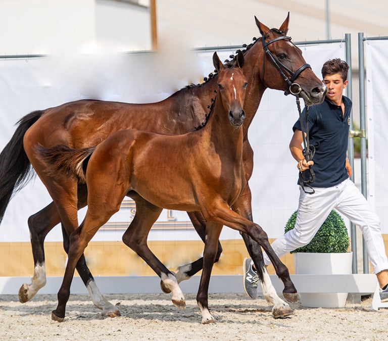 Conthafa E Chin is a well-balanced 3-year-old mare by Conthargos out of a Chin Champ mare, Dornröschen I. Her granddam, Noble VI, is the full sister to the 1.60m jumping stallion Collin 7. Her dam, Taariq, has already produced successful offspring competing up to 1.50m, including Zeelena and Bombay 36.