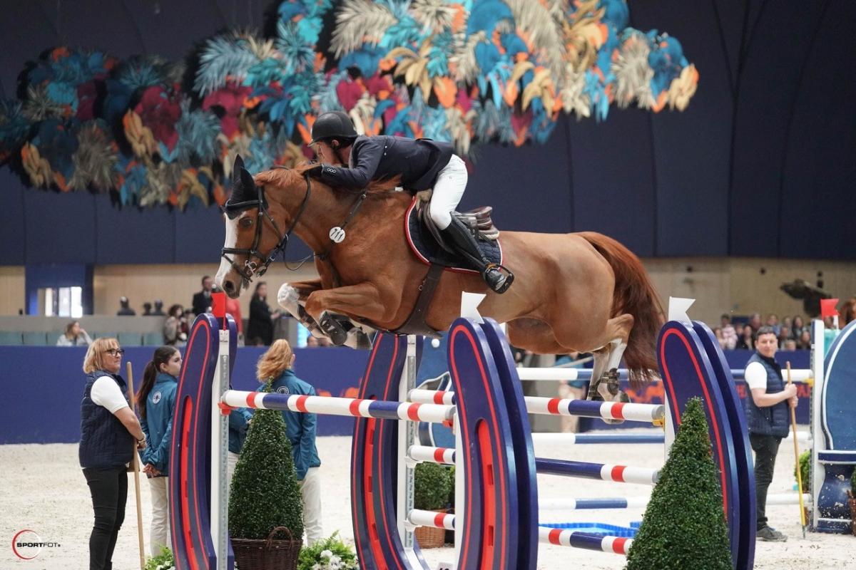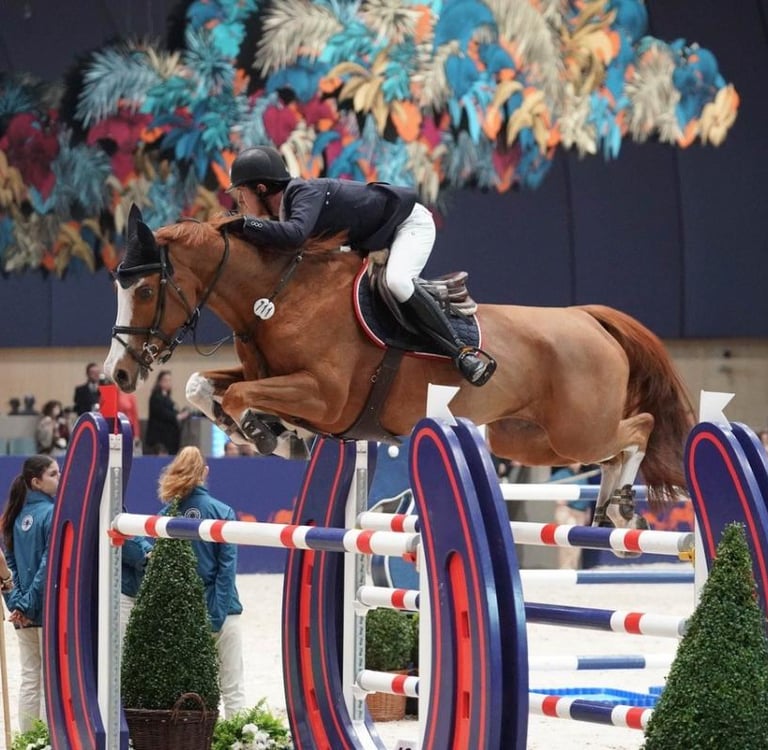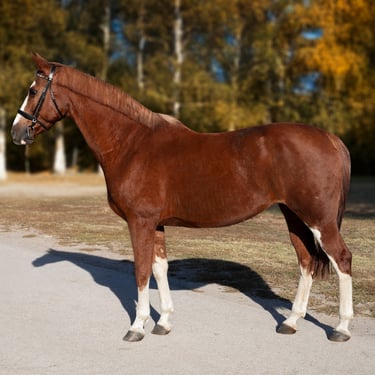 Americana is a top-class sport horse who competed up to 1.60m with riders such as Nano Healy (IRE), Jennifer Pedersen (DEN), and Harm Lahde (GER). She’s known for her excellent jumping technique, elastic canter, and striking looks—a chestnut mare with bold white markings and a signature white dot on her belly. Her sire, Aganix du Seigneur, is a proven 1.60m performer and world-renowned sire, producing numerous elite-level offspring.